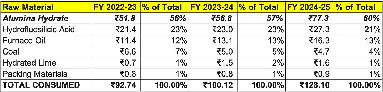 Since FSA supply is CRITICAL but outside company’s control AND/OR unviable to do in-house, the largest and single most impactful cost item is Alumina hydrate ( Alumina with water), which contributes consistently over 50% to the overall cost.