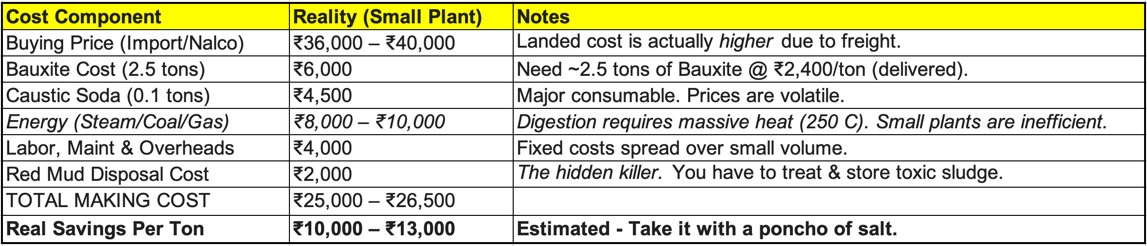 If this were accurate, the company would save 18,000 MT (Alumina hydrate) * INR 10,000/Ton - INR 13,000/Ton (cost saving) = INR 18 Cr - INR 23 Cr