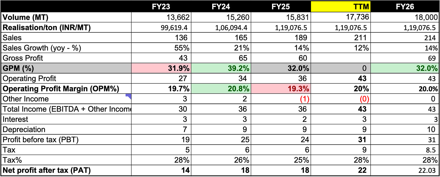 My estimate is that for FY26, at 18000 MT volume & last year reliasation/ton we’re not going to see major upside from what we’ve already seen in TTM numbers.