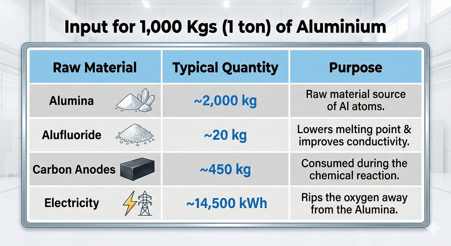 In short, Alumina (powder) is mixed in cryolite (non-reactive liquid) & Alufluoride (powder). A “pot” filled with this mixture is subjected to 300 KA to 600 KA current.